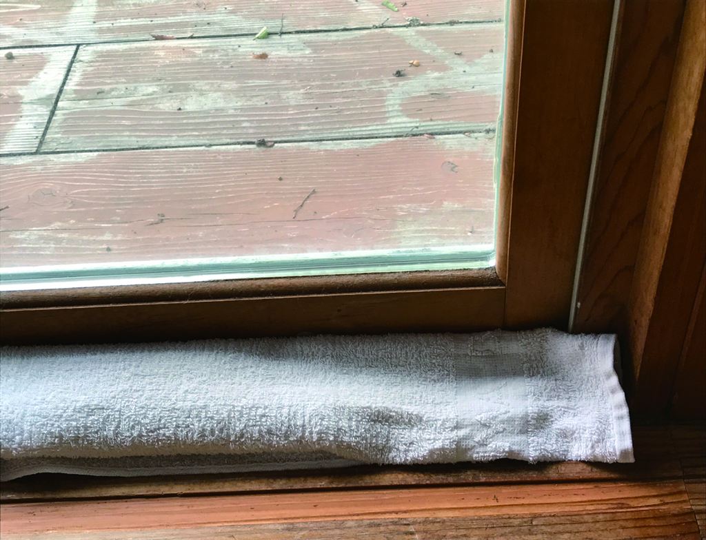 サッシの劣化等で屋外からの養生だけでは不足する場合は、木製サッシの足元やトップライトの下に、バスタオル等を敷き、床養生を行います。
