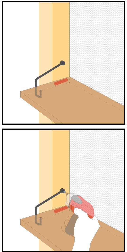 ※ビスケットが仮留めの状態で棚の上に物を置かないでください。棚が安定せず、物が落下する可能性がございます。 必ず付属のビスで本留めを行ってください。