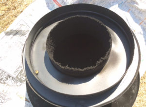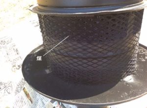 写真は燃焼効率が悪く、屋根の上の煙突の先端についたレインキャップに煤が付着している様子です。(写真1、2)